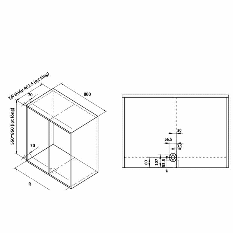 - Chiều sâu lọt lòng (S): Tối thiểu 470mm