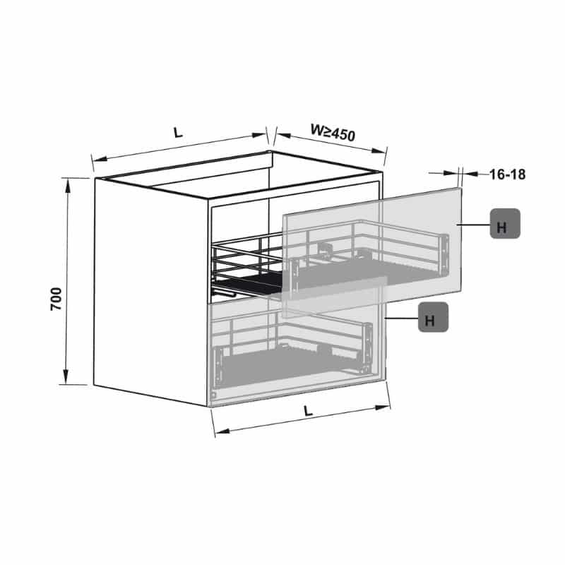 - Phiên bản : ray trượt và bộ rổ gắn với cánh tủ
