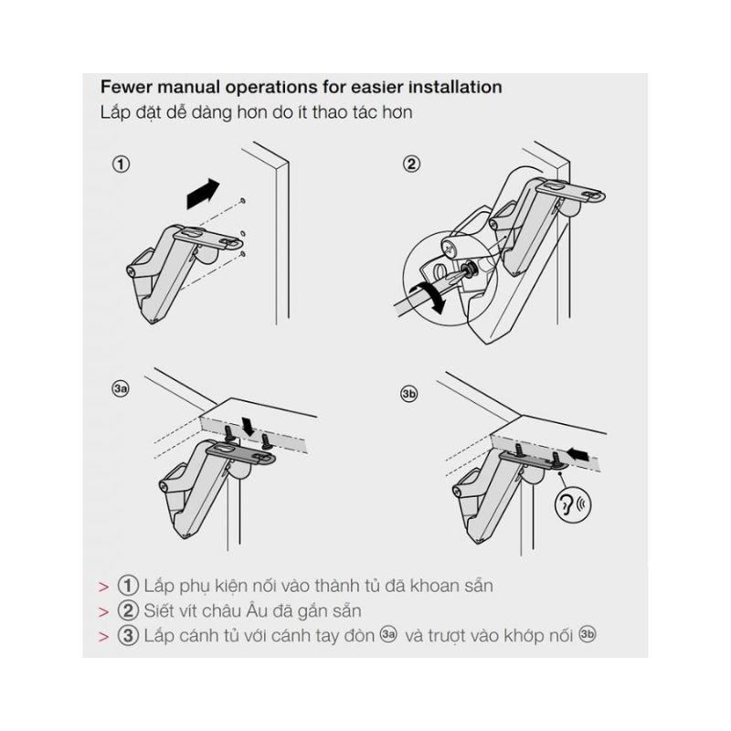 - Lắp đặt : kèm phụ kiện để lắp vít Châu Âu đã gắn sẵn, mặt tủ chỉ cần trượt vào vít đã gắn sẵn, không cần dụng cụ